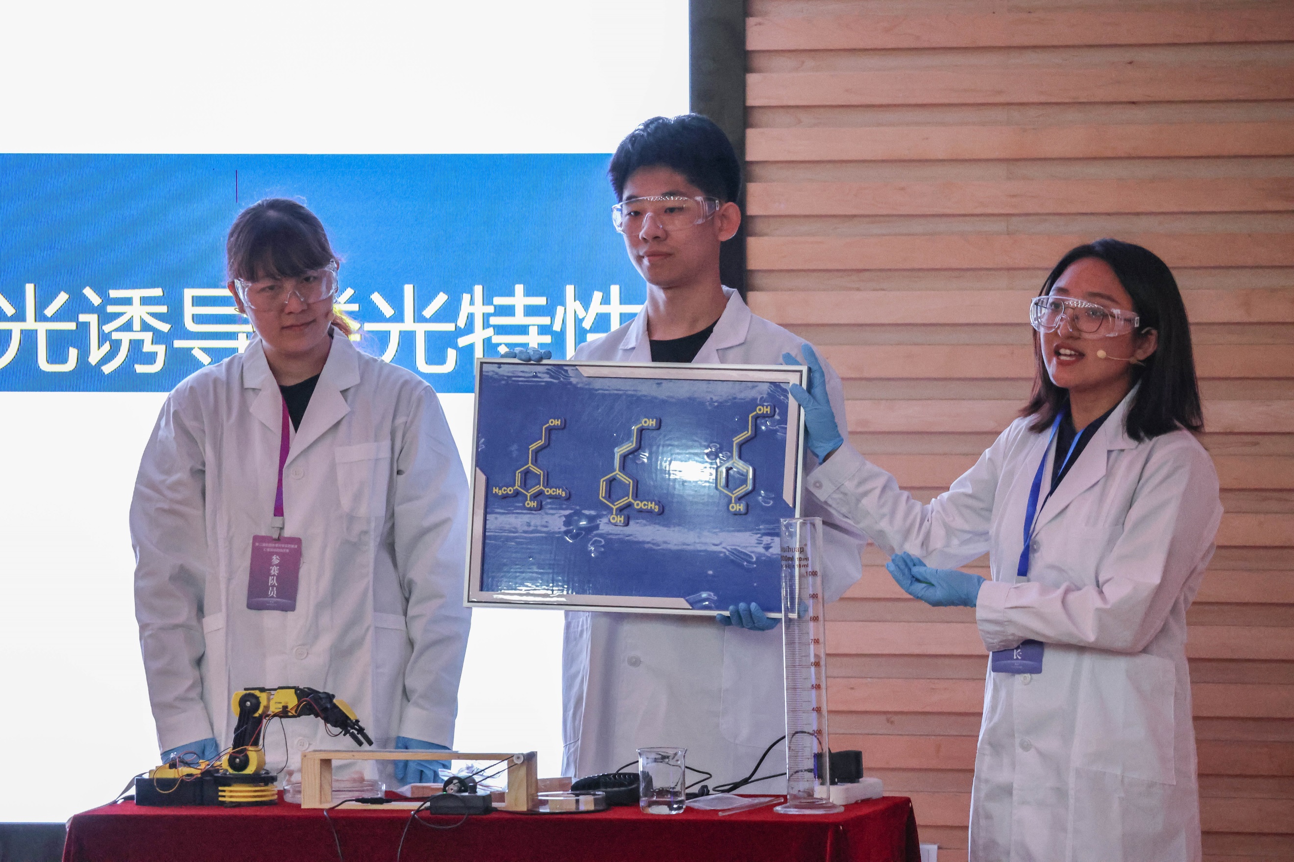 《神奇的夜光木材》项目通过开发独特的木材处理剂和利用芳香生物质“限域”技术,成功赋予普通木材光诱导室温磷光特性。在光源激发下,处理过的木材能够呈现出醒目的绿色磷光效果。夜光木材具有广泛的应用前景,不仅可以制作夜光木雕和发光家具,还可以用于防伪领域。通过先进的熔融挤出工艺与3D打印技术的结合,这种材料还能够被制造成各种定制化的发光材料,展现出创新技术与传统材料的完美融合。本次实验展演不仅是对科学实验方法的探索,也是对传统材料的再创新,向公众展示了林木资源利用中蕴藏的神奇光理化特性。本次活动的成功举办,不仅为林草科学研究提供了展示平台,也为推动我国林草事业的繁荣发展注入了新的活力。